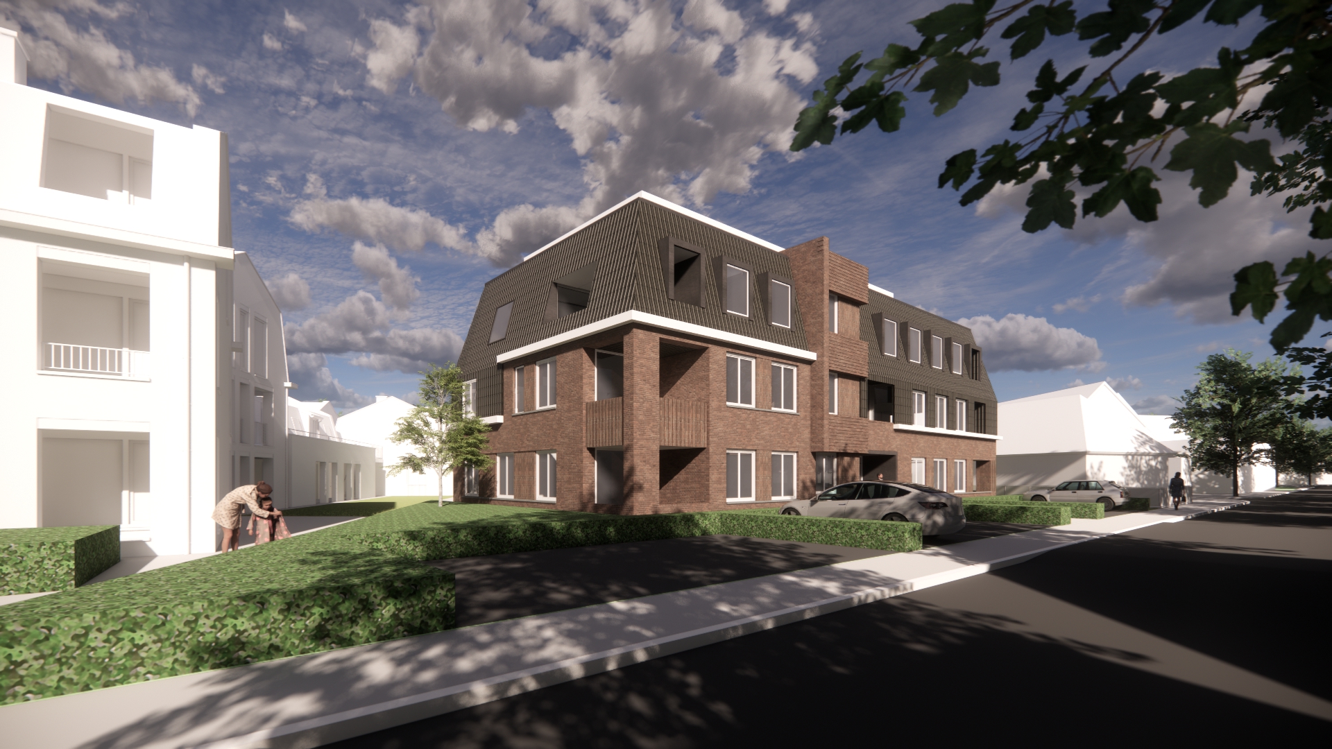 maak deze bestaande architectonische render fotorealistisch verbeter het gras en de begroeiing zodat deze natuurlijk en gevarieerd oogt met realistische texturen diepte imperfecties en subtiele kleurvariaties zoals in een echte nederlandse tuin of buitenruimte verbeter het glas door realistische reflecties en lichtbreking toe te voegen met een natuurlijke balans tussen spiegeling en inzicht naar binnen waarbij het interieur zichtbaar blijft inclusief realistische gordijnen binnenverlichting en interieurdetails maak de dakpannen realistischer als een typische jaren dertig antracietkleurige dakpan met gevelpannen en in lijn met hoe ze doorgaans in nederland worden uitgevoerd correcte verhoudingen geloofwaardige detaillering materiaalafwerking en aansluiting op het dak vervang waar mogelijk de aanwezige personen door fotorealistische mensen met natuurlijke houdingen realistische schaduwen correcte schaal en geloofwaardige kleding passend bij de omgeving zonder de compositie te verstoren behoud exact de bestaande verhoudingen afmetingen camerahoek en compositie behoud de huidige materialen en kleuren maar verfijn ze subtiel zodat ze natuurgetrouwer ogen realistische ruwheid reflectie veroudering en detailniveau verhoog de algehele lichtbalans schaduwwerking en materiaaldefinitie voor een hoogwaardige architectuurvisualisatie met een fotografische uitstraling upscale de afbeelding naar 4k resolutie met scherpe details en zonder artefacten stijl fotorealistisch high end architectural visualization natural lighting real world materials dutch residential context