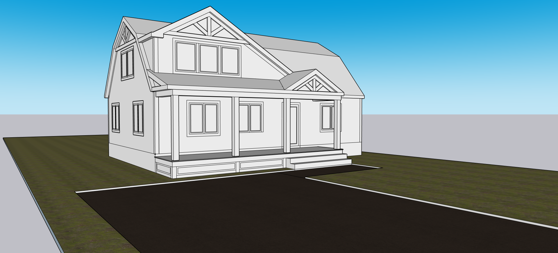 off white clapboard siding with white windows white trim in the truss roof white trim and 6 wide white corner boards asphalt shingle roof white truss in gables front porch covered composite deck white columns threes in the background and bushes near the house plants on the porch and some exterior wood furniture on the covered deck make the walkway and driveway earth tone pavers and make them match the driveway shape in the image all windows shall also match the image keep the scale of the furniture real too