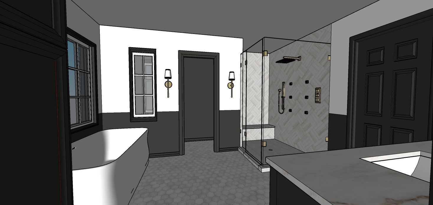 maintain all model geometry this should feel like a high end primary bathroom there should be a few square can lights with soft dim light the casework and trim should be painted in a semi gloss finish with the color from the original image the room should feel bright and airy the tile floor should be rendered as marble with the pattern shown the shower should also be marble tile as shown the countertop is a white marble the window next to the sconce light should show another window directly behind it letting light spill in from both there is no door on the cased opening between the sconces show panneling beyond the cased opening full height on that wall that matches the wainscoting the color should match the trim the wainscotting should be framed show an expensive looking window treatment on the window to the left of the bathtub