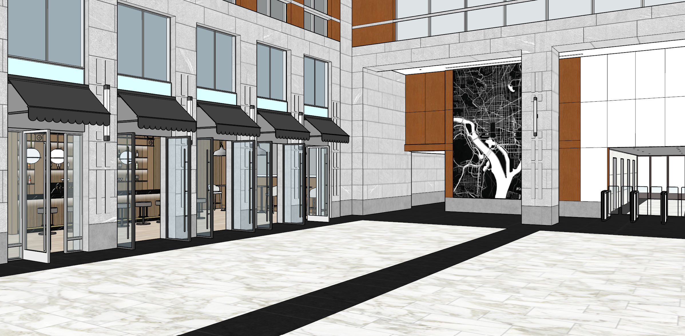 render lobby with no outside views all lights to be turned on all interior to be bright and lit modern organic sofas in front of cafe openings