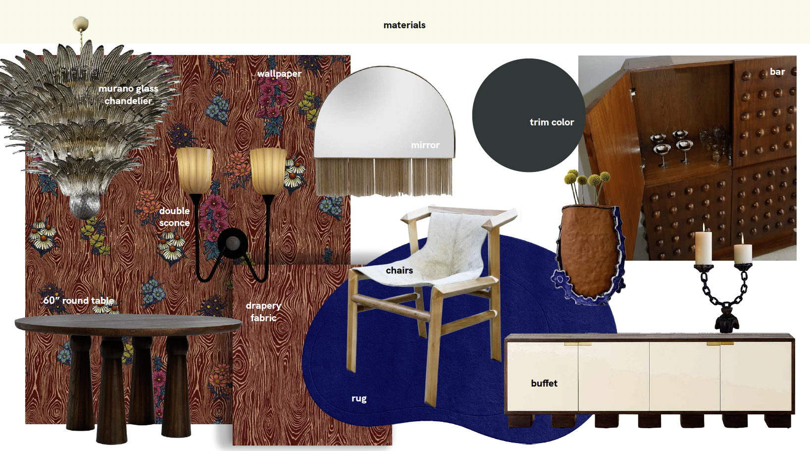 can you remove the wording and put 6 chairs around the table put the wallpaper on the walls chandelier in the middle drapery patterend fabric