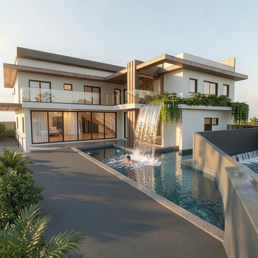 nordic exterior shot keeping the same view looking at and through the foreground buildings can you make this photorealistic the foreground buildings should be a dark slate cladding pool house walls and roof with a view through to the main house with a pale silver timber cladding sitting over a darker stone ground floor level with large sliding glass doors and a dark metal canopy between them with a realistic swimming pool in the foreground and a view out over padstow bay in the background keeping the same view and showing neighbouring buildings with a white rendered single storey bungalow on the left and a large 2 storey edwardian pebble dash villa on the right both with slate roofs on the other side of the garden walls add planting and garden furniture outside the building and some people on the terrace and also some activity in the pool add some more clouds to the sky the top parts of the gable extensions should be wide board warm silver timber cladding the lower parts are a medium dark stone the garden walls in a drywall stacked cornish granite and the main roof would be a welsh slate architecture