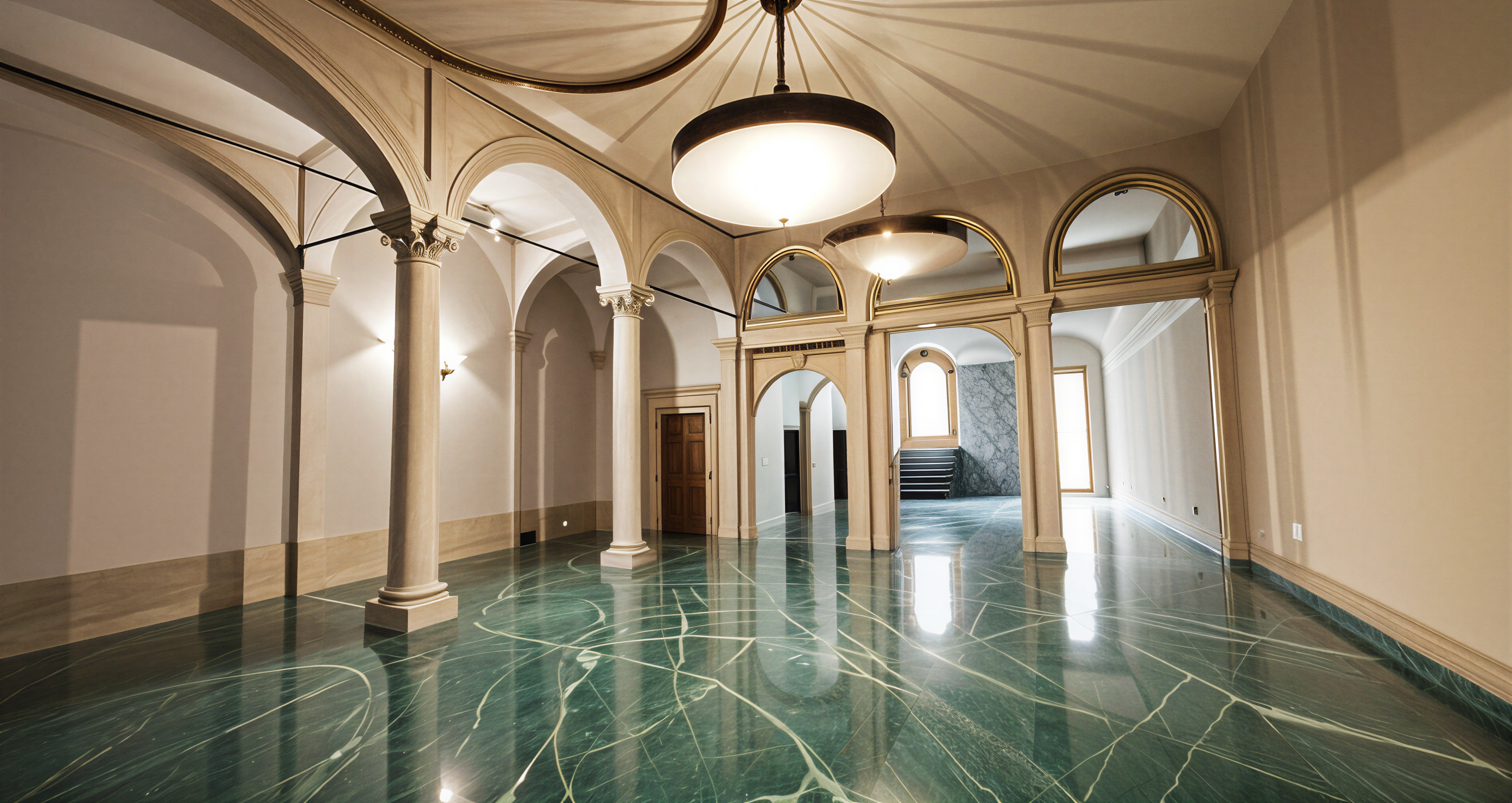 change the floor with an elevated flooring of pure white stone in the left only where the columns are and maintain existing floor in the center