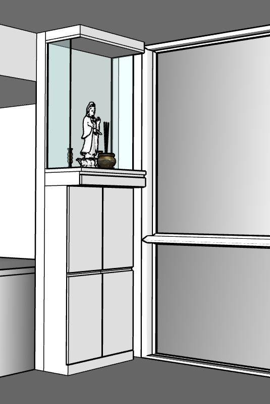 without handle altar cabinet with incense and guan yin ma in cabinet in white laminate finish