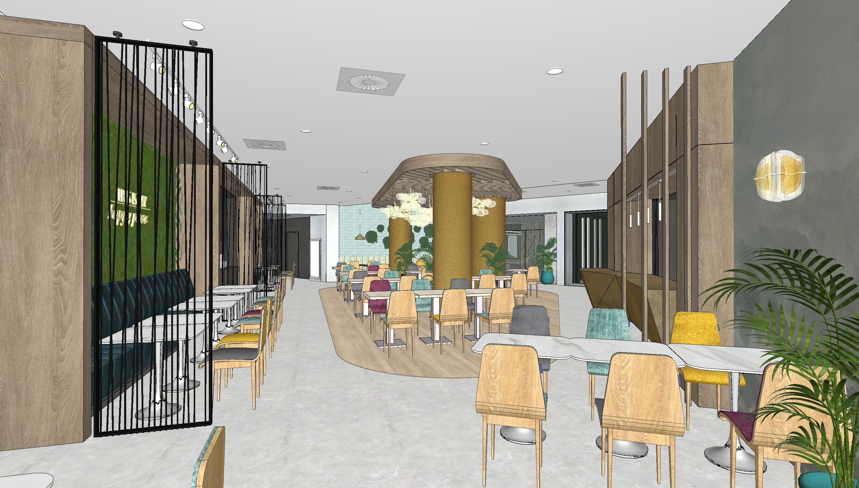 k sz ts f nyk pet m g tt nk l v ablakon kereszt l sz r dik be a nappali f ny az sszes l mpa vil g t tartsd meg a b torokat a burkolatokat s sz neket tartsd meg a falburkolatokat a l mp kat a d s n v nyzet z ldfalon vil g t neon felirat az tkez asztalokhoz tegy l tkez vend geket tegy l vend geket a k pre j b torokat ne tegy l a k pre