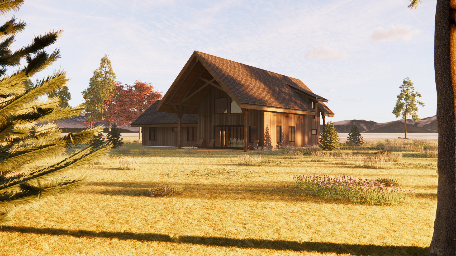 cabin near pond on side of hill river below