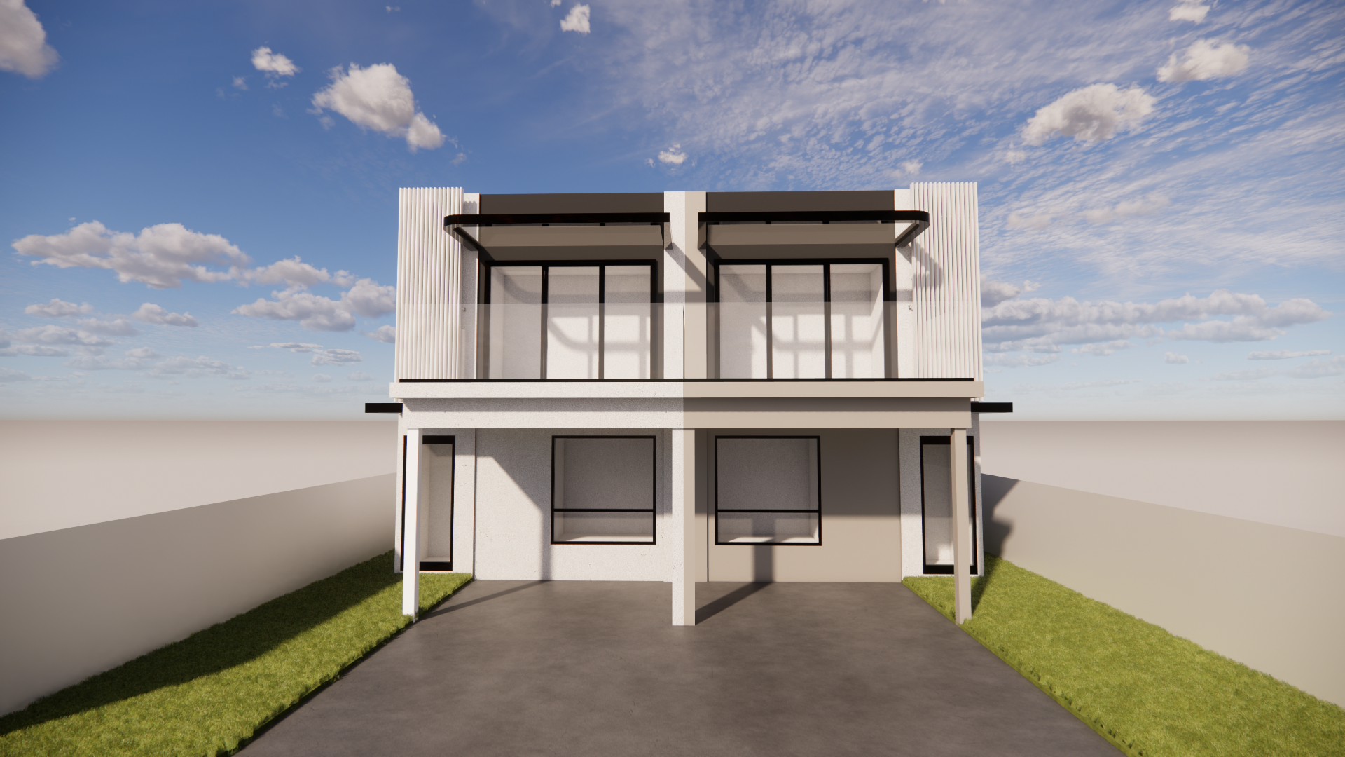a front view perspective of a 2 storey townhouse with entrance at the side with the front lawn and surrounding timber fence