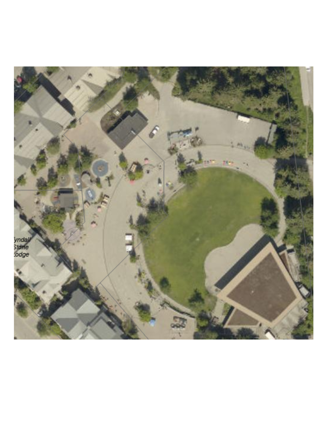 aerial view of a picturesque park with a lush green lawn surrounded by diverse buildings and pathways the buildings are painted in soft grays and browns with rooftops in muted earth tones the pathways are light gray curving through the area alongside vibrant landscaped greenery trees in rich greens cast gentle shadows on the ground the atmosphere is peaceful and sunny with a clear blue sky include colorful elements like small play structures in red blue and yellow to add vibrancy
