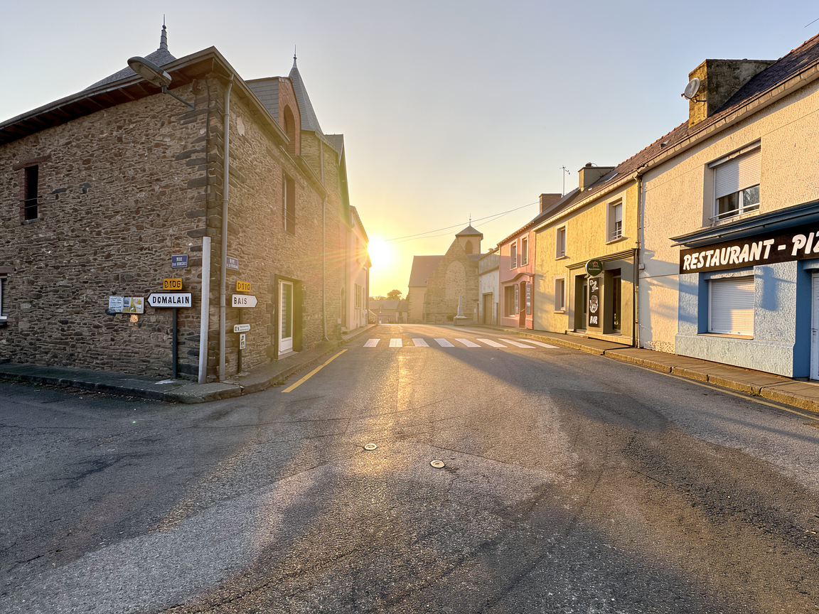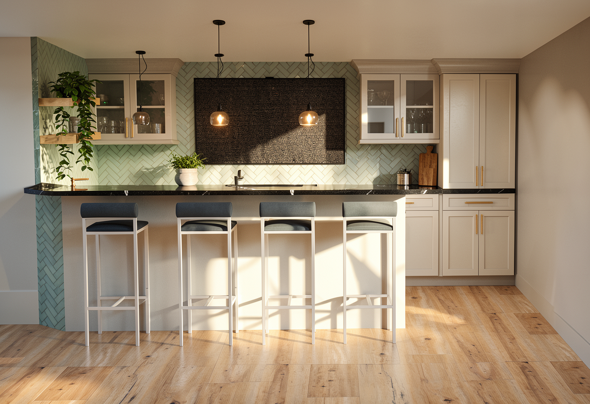 kischen top and splashback on the left are in sand color limestone matte green wall in the background is plain color not textured lights on in the chandelier upon the table lights on under the kitchen cabinet