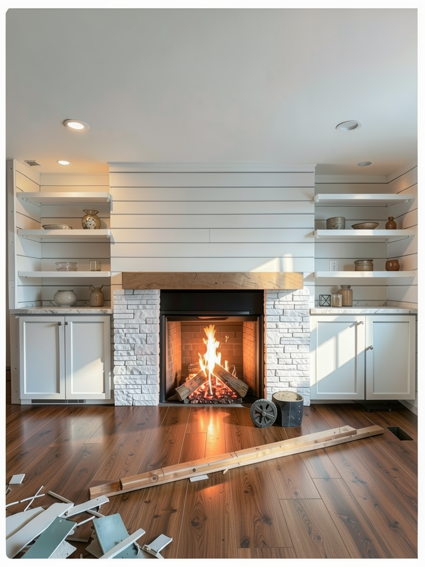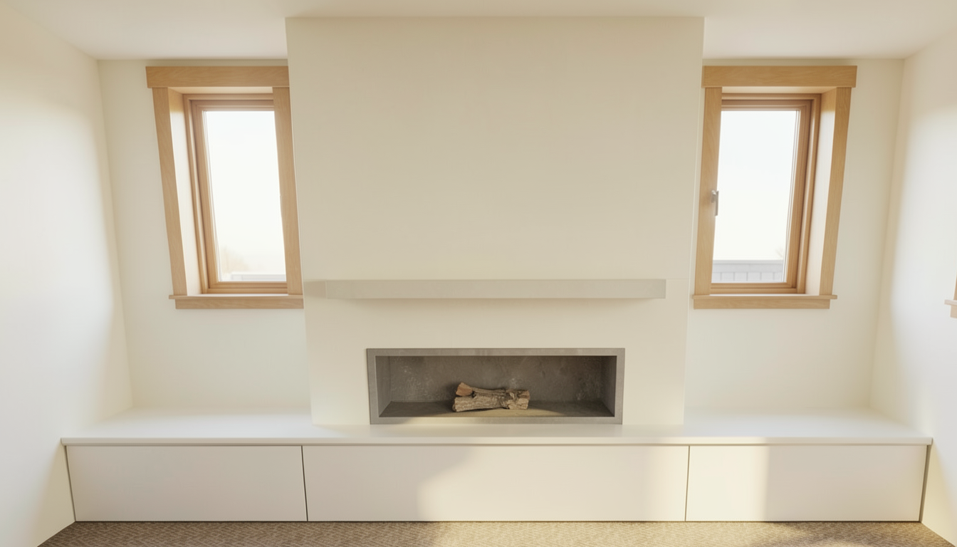 make the fireplace surround a scandinavian look with 6 cabinets in white oak under the hearth