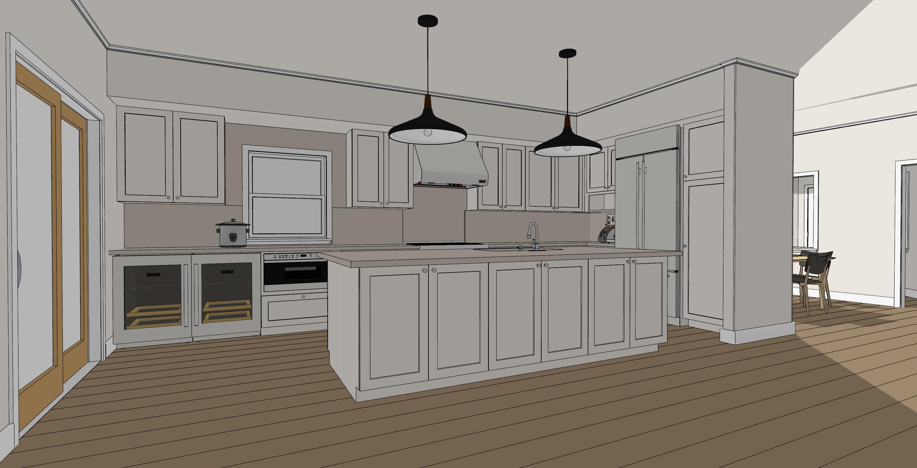 create photorealistic render add baseboard around kitchen island make cabinets modern in style with modern hardware