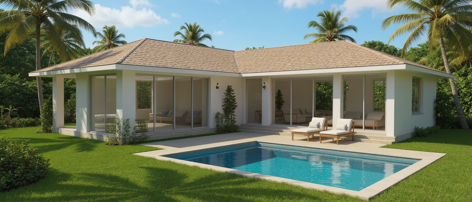 create a hyper realistic exterior photograph of a modern house rear exterior during a vibrant sunny day the house has a sleek tropical modern design with crisp white walls contrasted by some coral stone walls large glass windows reflect the clear blue sky palm trees with their lush green fronds add a tropical touch the house has surrounding green lawn the atmosphere is tranquil and luxurious with sunlight casting gentle shadows evoking a sense of relaxation and opulence