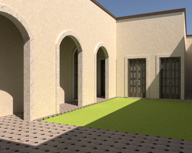 mexican classical architecture facade elegant and timeless design second internal facade of an old house converted into residence central courtyard facade with symmetrical composition series of tall rounded arches windows traditional mexican mediterranean style central patio in front with fountain stone pavement vegetation potted plants bougainvillea palm trees soft landscaping historic renovation style preserved old construction feeling but refined and professional elegant calm clean warm atmosphere natural daylight soft shadows realistic lighting architectural visualization ultra realistic render high detail professional archviz wide angle lens balanced proportions symmetry high realism 8k cinematic quality