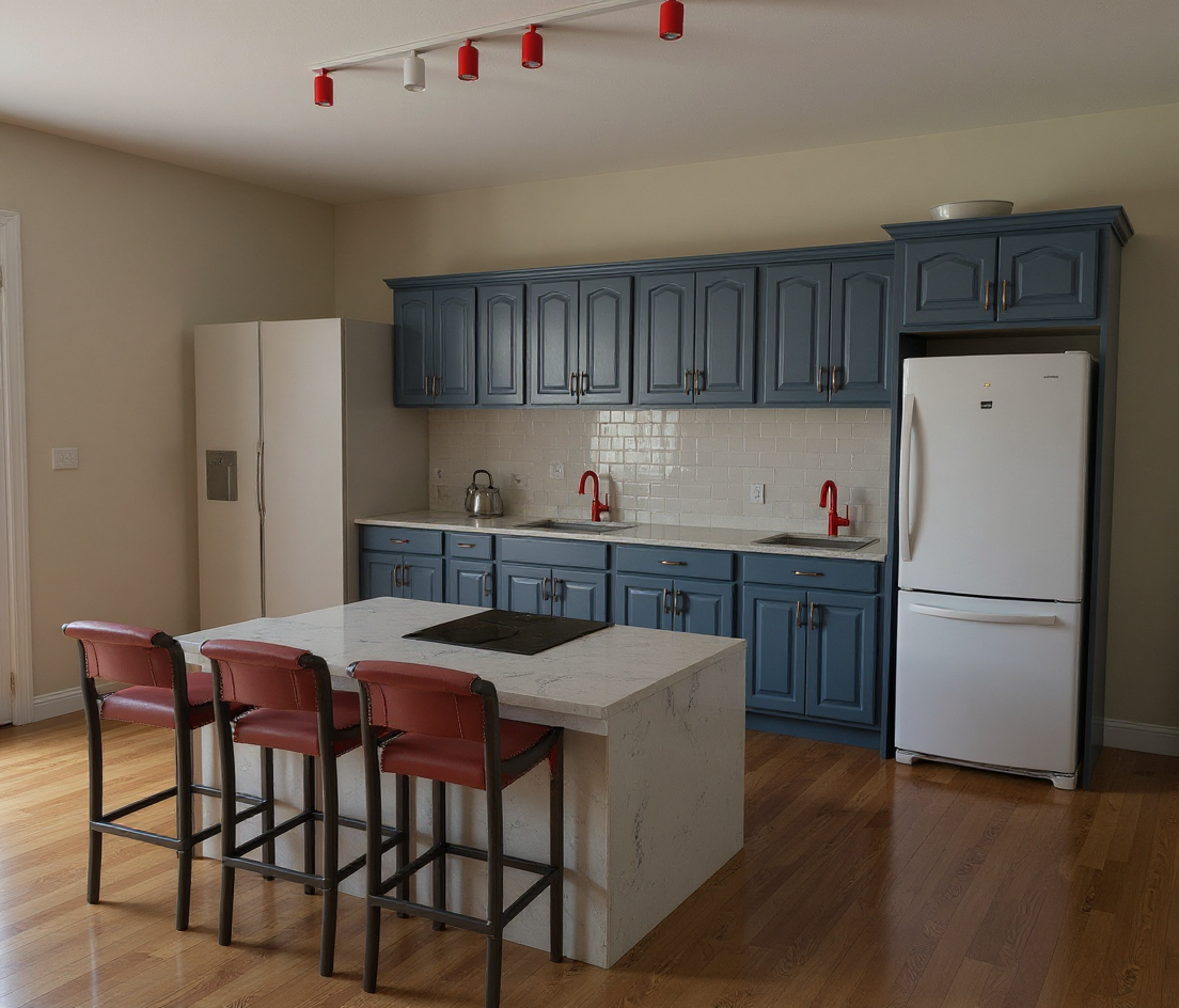 the kitchen style countertop and backsplach marble verde alpi verde with warth wood cabinets the dining table is a wood the table is behin the sofa aluminium windows view in a luxuriant garden reaslistic render place the table behing the sofa