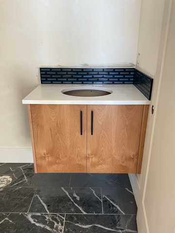 do not change the cabinets in any way preserve the exact cabinet colors materials finishes dimensions door and drawer styles hardware spacing alignment and all geometry exactly as shown do not alter the countertop shape backsplash appliances flooring lighting fixtures or wall structure only remove the construction materials clutter and mess from the scene clean the room and make it look finished and staged add a few simple tasteful home accessories appropriate for the style of the space but do not add or remove any furniture windows or architectural elements maintain the original lighting direction and realism enhance clarity and polish the photo while keeping the cabinetry and room design completely unchanged do not alter the lighting to keep the cabinet colors as they are in the image add mirror sink and faucet stage countertop for a bathroom add lighting underneath the cabinets add a toilet to the left of the vanity to cover the hole in the floor