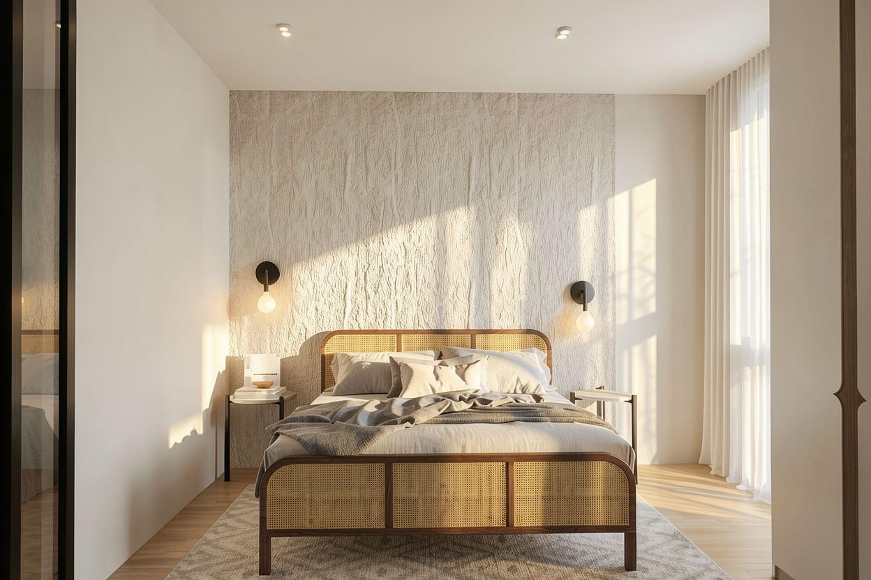 modernist wide angle shot follow the image exactly like the window walls door make this interior more cozy make like hotel or resort facade no bricks texture architecture