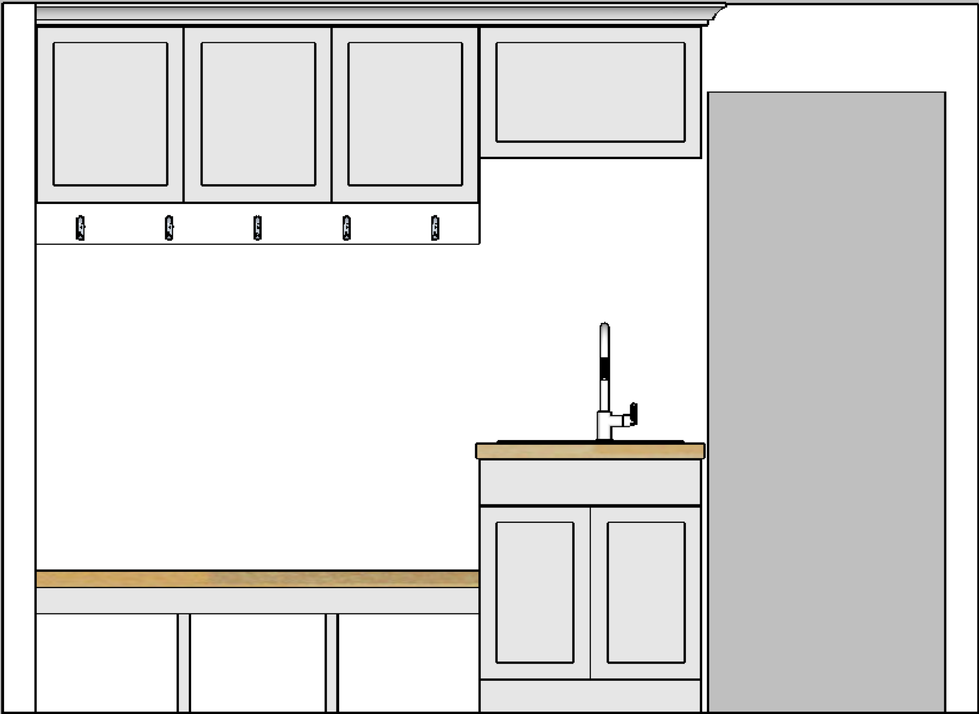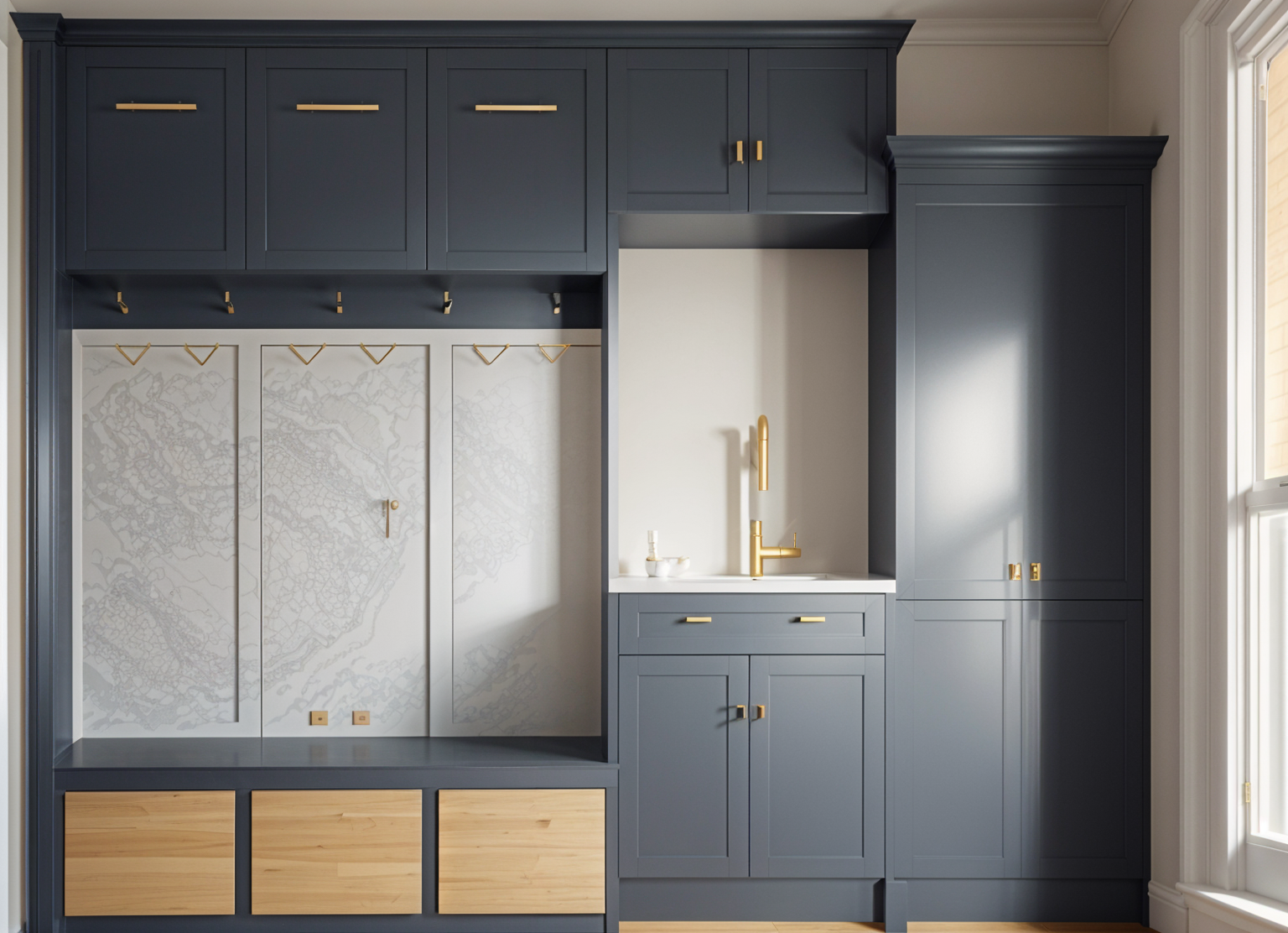 bright sunny modern mudroom with wood top bench and counter top coat hooks upper cabinets in a gray tone lower cabinet white tiled wall and backsplash architecture