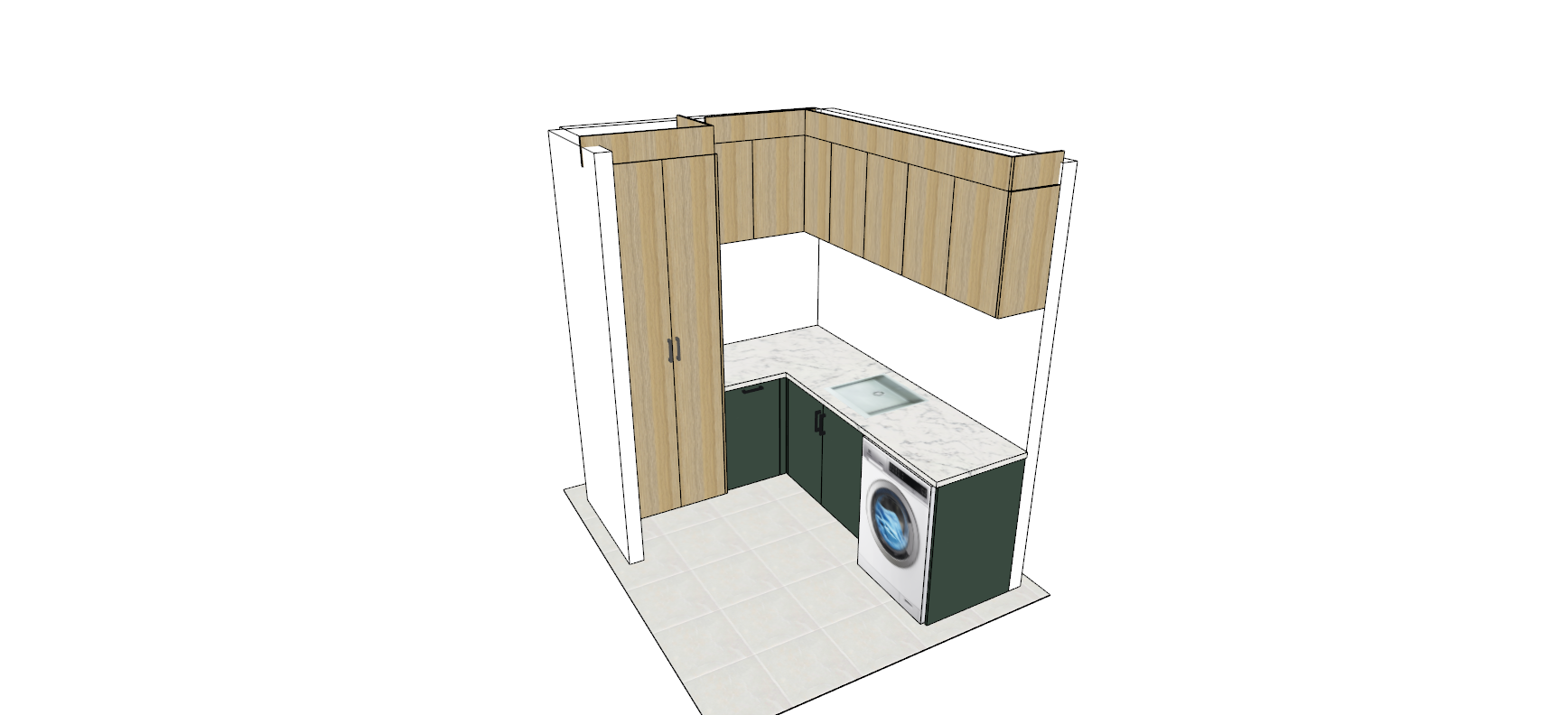 cupboards to be flat panels put evening sunlight coming through clothes on a hanger under the cupboards over the sink whole length of wall strip led shining down from underneath overhead cupboards