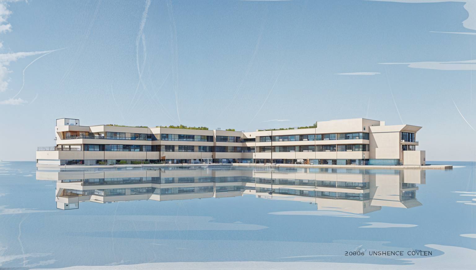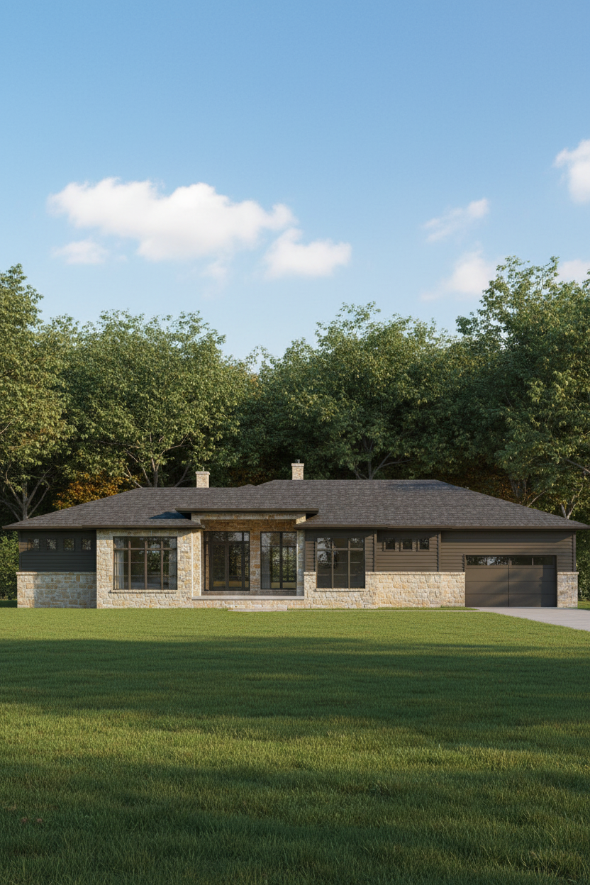 tudor revival exterior shot render a modern single story house with a triangular roof and large bay windows the exterior walls are painted in a soft pastel blue providing a tranquil and inviting appearance the roof has a crisp white finish adding a touch of elegance the windows are framed with dark grey trim for a sleek and modern contrast the front door is painted in a warm welcoming mahogany brown set the scene during a sunny day with a clear blue sky and soft fluffy white clouds include green manicured lawns and vibrant flower beds with reds yellows and purples around the house the atmosphere is peaceful and serene reflecting a perfect suburban afternoon with bay windows architecture