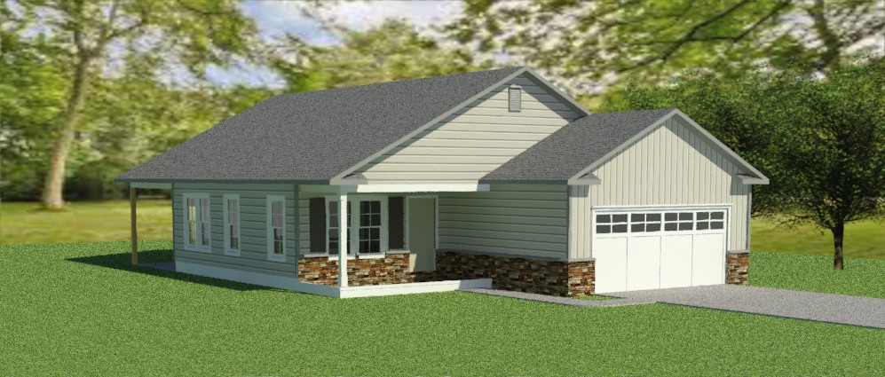 its a house with light color horizontal siding and a light color stone for the foundation wall it has a light color vertical siding on the garage wall the house has asphalt shingles there is a concrete drive way and a stone path from the drive way to the porch of the house there are some trees in the background with a sunset coming from the front of the house add light fixture on both ends of the garage wall and one light fixtures on the porch door wall