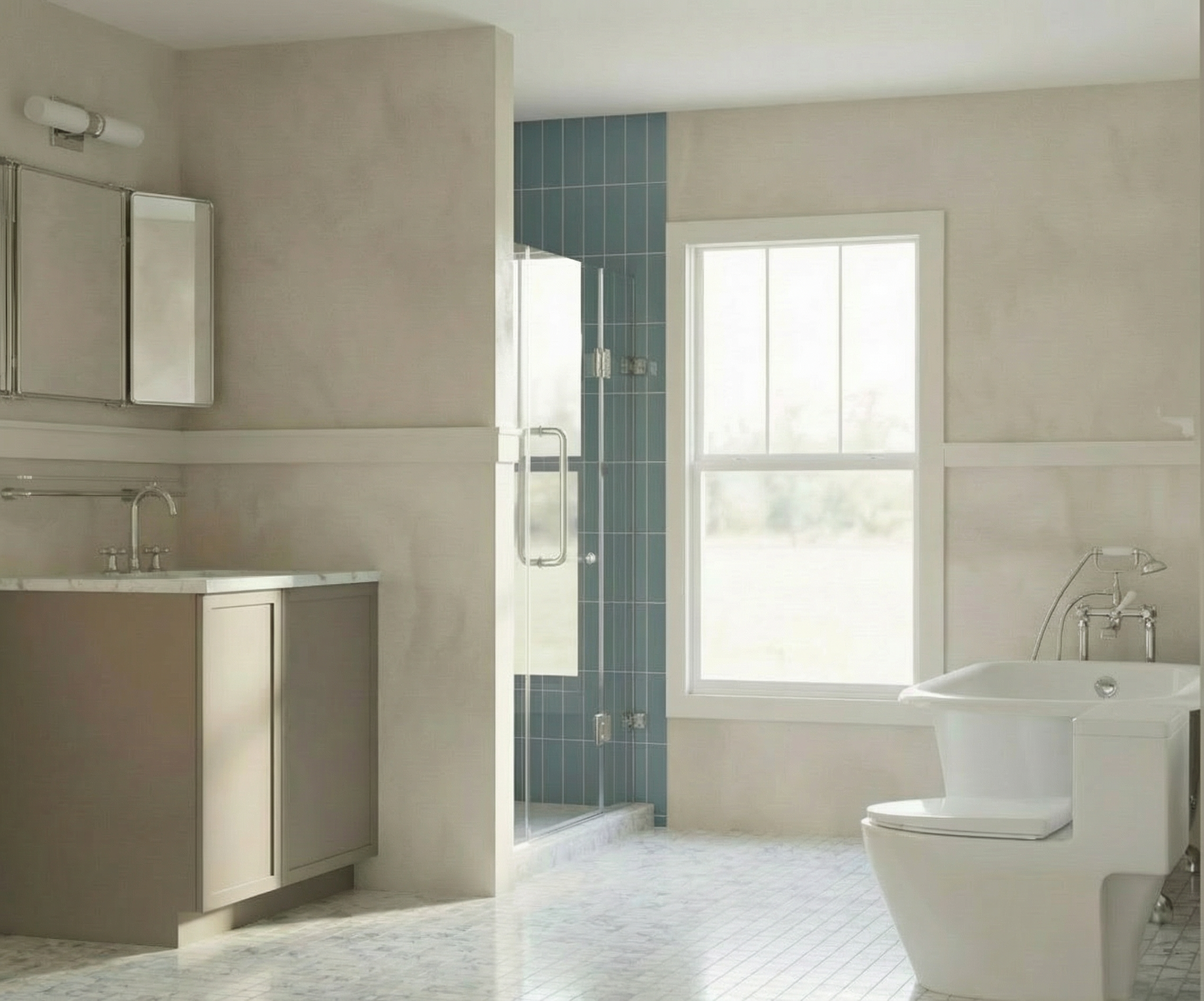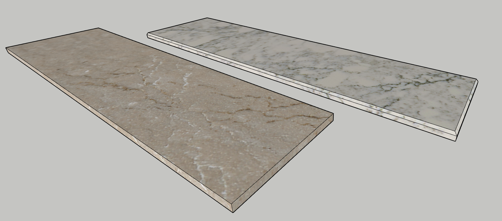 create a photo realistic render of these two tiles sitting on a neutral wood tabletop with a tight enough shot to identify the difference in the egde profiles while preserving all stone design and color characteristic with very subtle soft natural lighting the first sample has a straight edge and the lighter marble look has a subtle chamfer edge