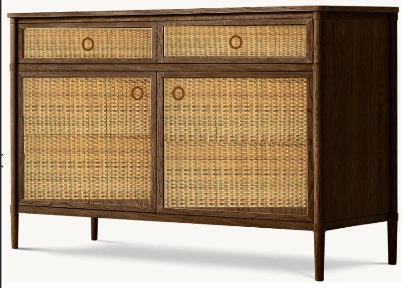 accent dark raffia weaving cabinet drawers and doors teak wood finish