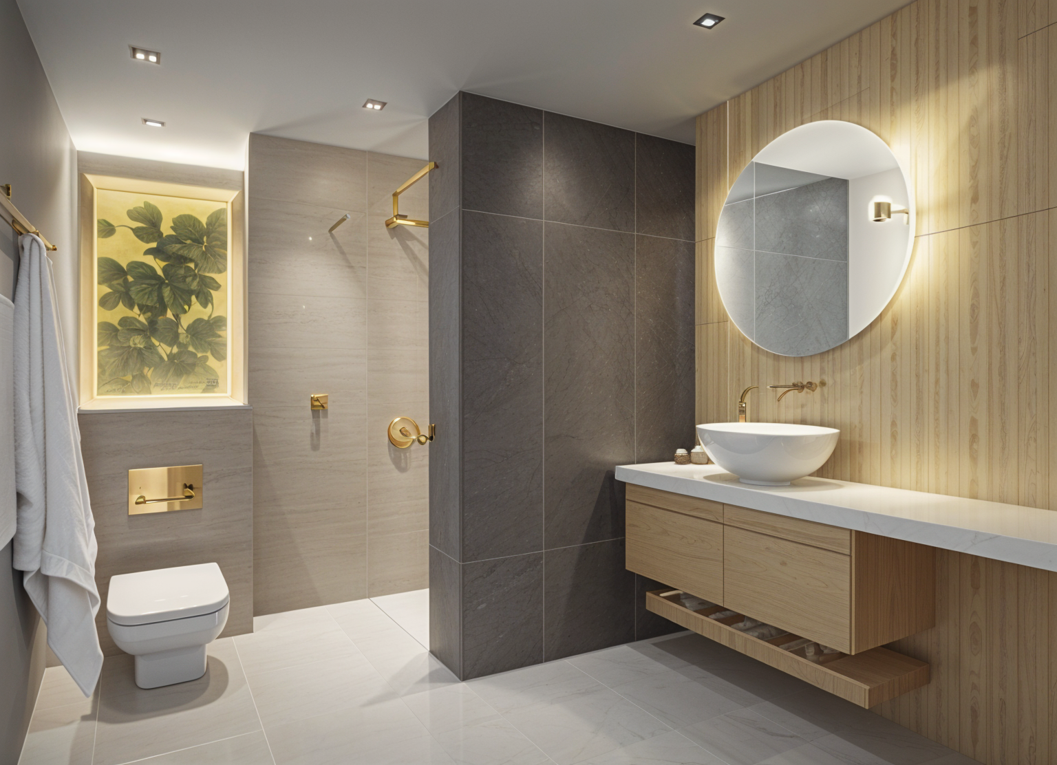 modern interior shot render a modern elegant living room with light beige furnitures create a calm space with soft lights use a dark brown color for the walls to add depth and choose a warm natural wood tone for the floor the ceiling should be a subtle light beige to complement the overall atmosphere gold details enhance the mood with soft shadows and highlights reflecting a calm and sophisticated atmosphere architecture