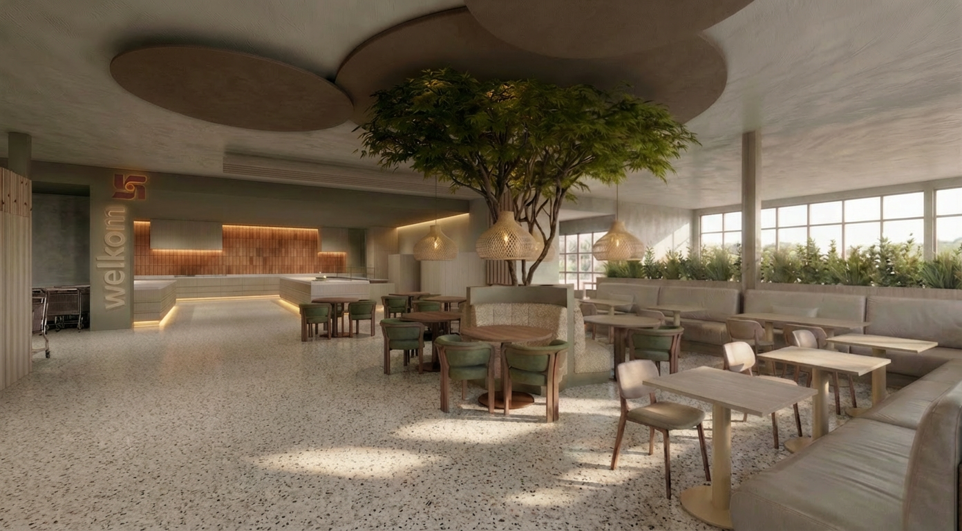 replace the club table with a rectangular and add microphones for a podcast along with people