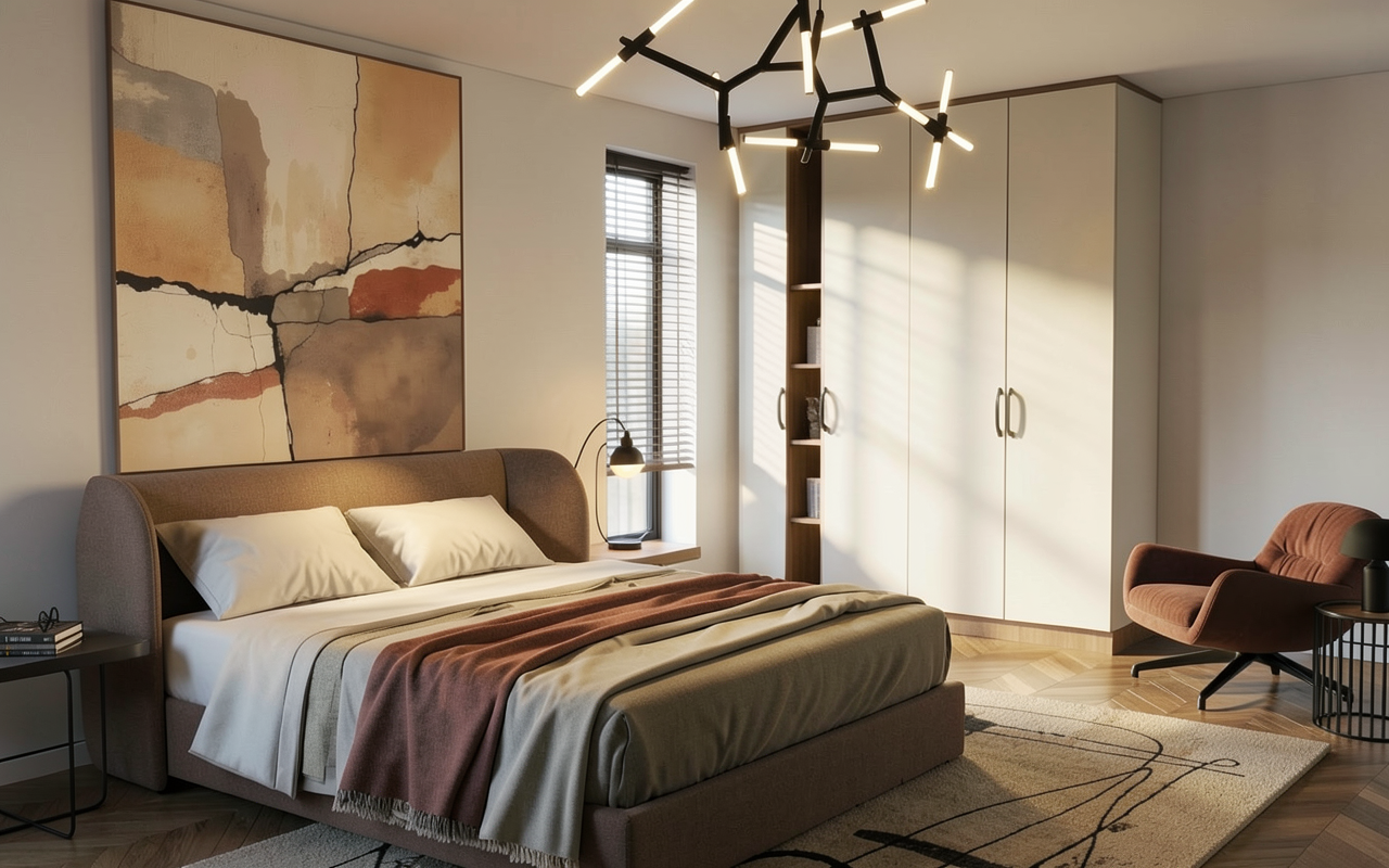 ultra realistic interior render in japandi minimal style soft natural daylight streaming through a large window creating gentle shadows and a calm atmosphere neutral color palette with warm whites beige soft greys and light wood tones clean lines uncluttered space and balanced composition materials natural oak wood linen fabrics textured plaster walls matte finishes subtle concrete elements furniture is low profile scandinavian inspired with japanese influence minimal decoration lighting diffused sunlight slightly warm tone soft shadows realistic light bounce serene and airy mood camera eye level perspective 35mm lens depth of field high dynamic range photorealistic textures global illumination ray tracing mood calm refined minimalist luxury cozy but spacious with a focus on light and materiality