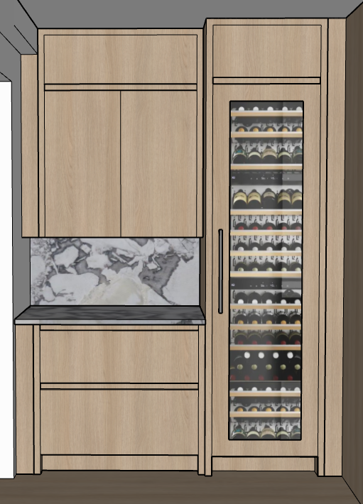 set horizontal handles deeper into doors make horizontal handles metal don t touch vertical handles make wood colors on floor and cabinets match light rift cut white oak make no other additions