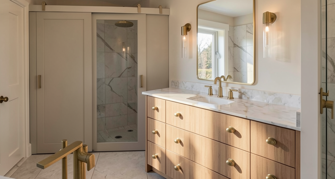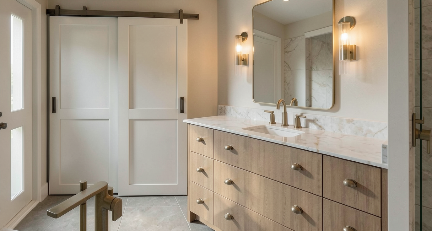 remove barn doors add 2 sliding cabinet doors at the back wall 48 wide with a 2 shaker with no mirror make the door on the left hand side to be a normal interior door with molding