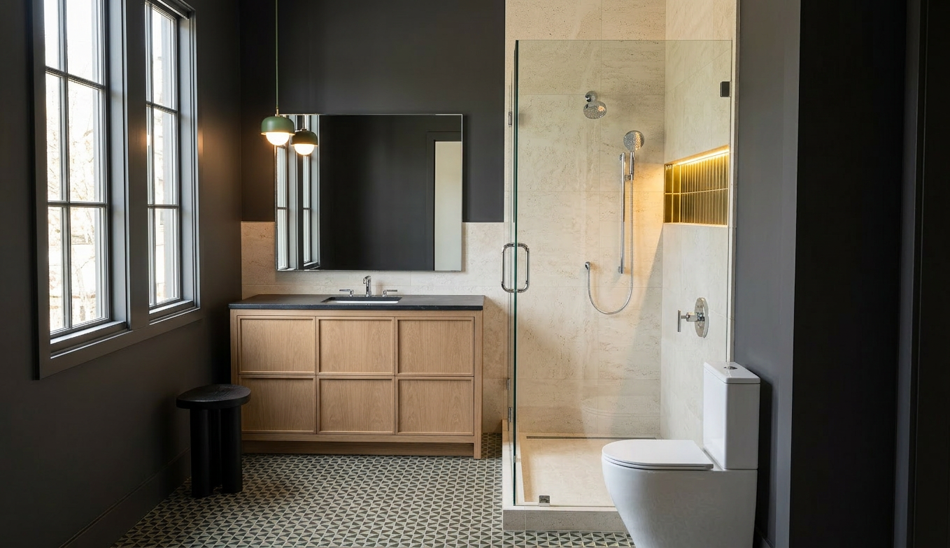 maintain colours make sure countertop is white and the feeling is bright airy feel but add led to the shower niche