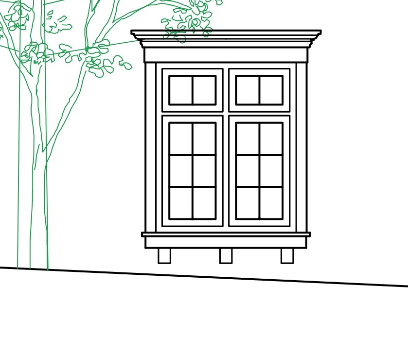 exterior shot change the bay window arrangement to the exact number of panes as the moodboard keeping everything else exactly the same as the source image