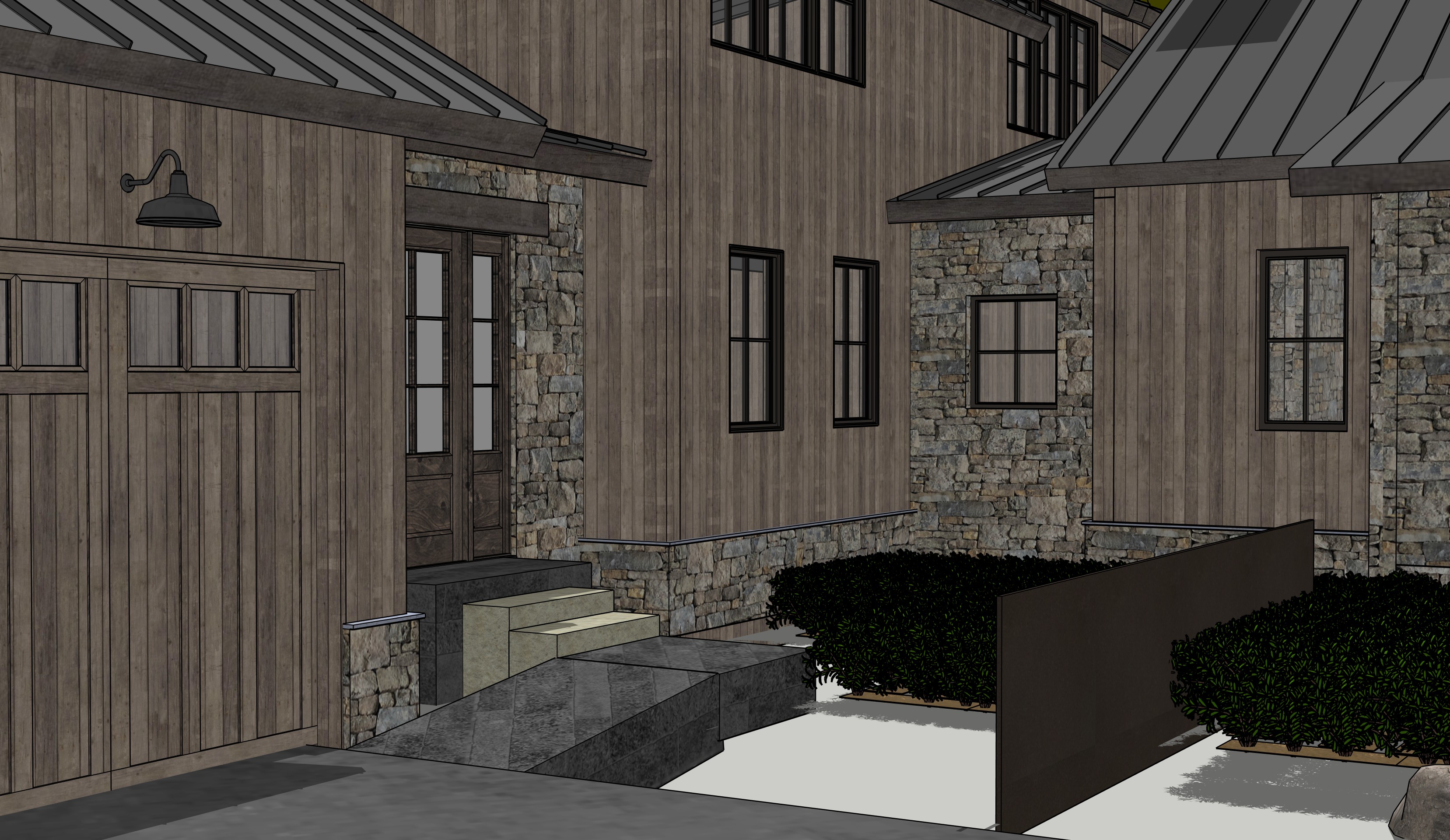 render a photorealistic 3d perspective of this house in jackson wyoming reference the current material style just enhance them charcoal standing seam metal roof vertical wood siding stone veneer walls keep model geometry the same windows doors roof walls cut stone walkway to front boardwalk landing where green fill in with lush vegetation around patio spaces that looks native to jackson wyoming asphalt driveway vertical steel charcoal colored panel in landscape do not change the view only enhance the current materials and make the landscape nicer vegetation detailed textures in the wood siding and glass reflections and a vibrant clear sky with light atmospheric depth render in hyper realistic architectural visualization quality 8k resolution
