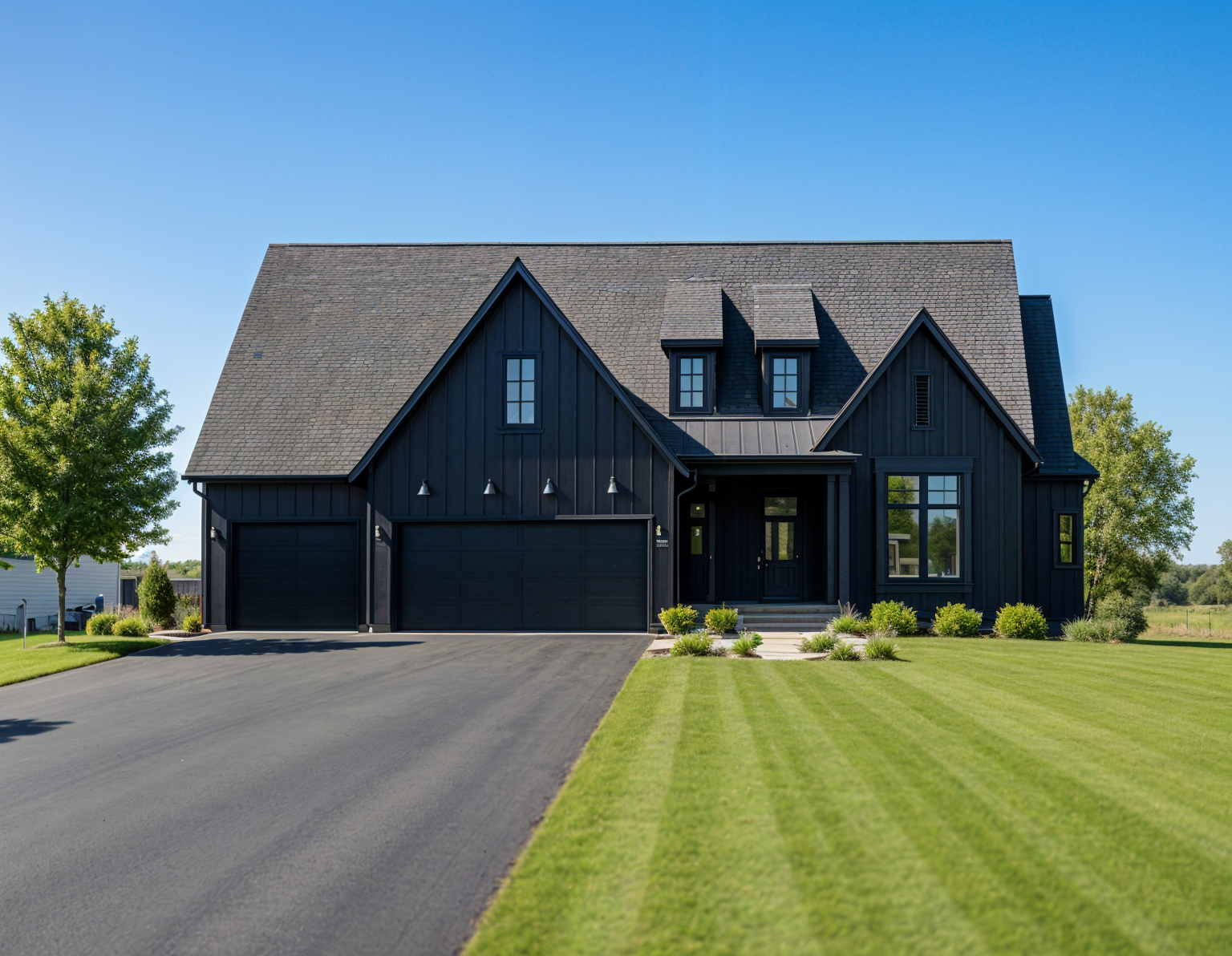 exterior shot photorealistic picture of the front of a coastal home with metal roof white frame windows blue sky with white clouds and sunny day