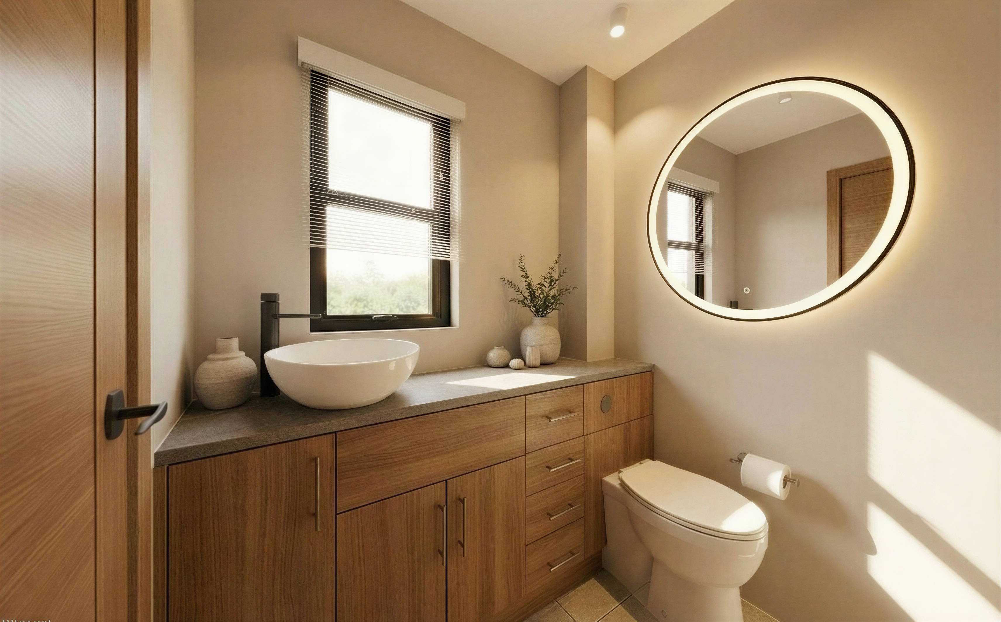 keep this bathrrom the same but change it so the units are a royal navy blue the handles and the taps aregold with the worktop being a white and gold marble