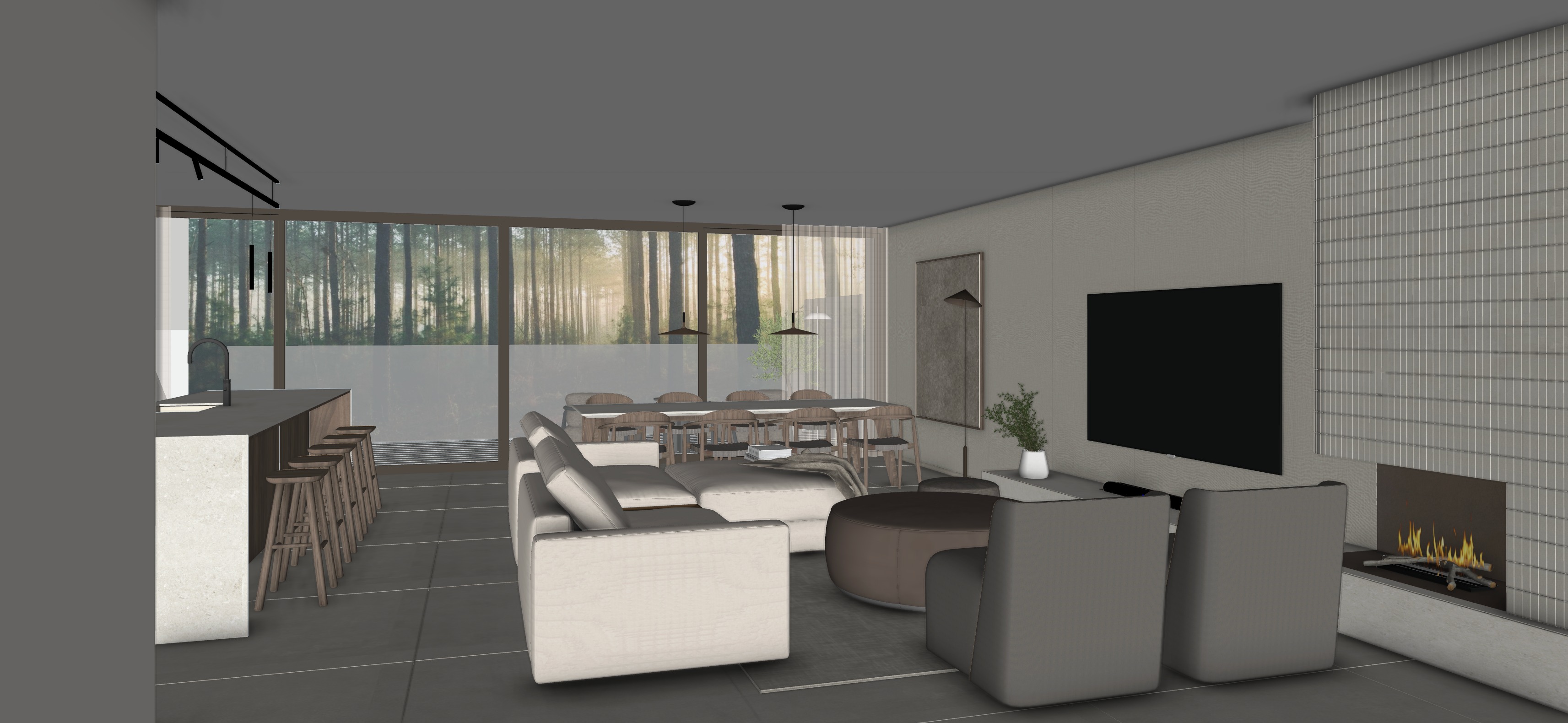 photorealistic interior render warm natural material palette with dark stained timber joinery natural stone surfaces and soft warm beige tones throughout strong natural daylight streaming through rear windows with visible sun rays casting soft warm light across the interior diffused light through sheer linen curtains clean minimal pendant lighting micro cement or polished plaster ceiling and walls rear garden visible through windows featuring tall mature pine trees refined contemporary residential interior with a calm understated atmosphere high end architectural photography quality golden hour warmth soft natural shadows warm colour grading
