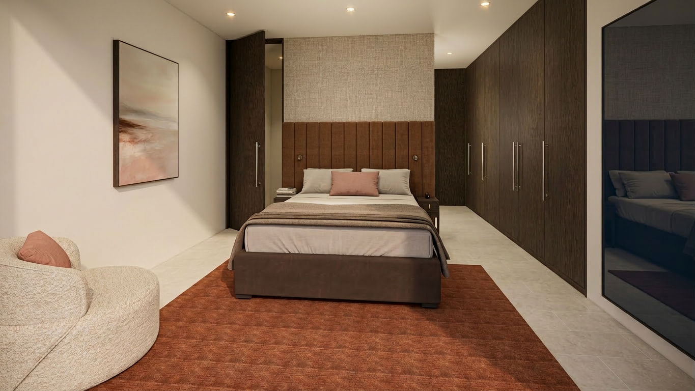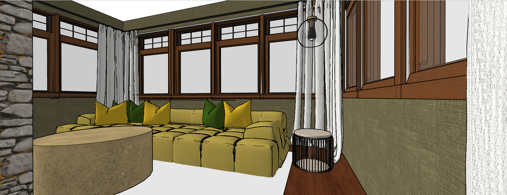 a cosy tv room has a stone fireplace timber floors and a timber ceiling olive modular couch with satin scatter cushions in pale olive and deep olive shades a luxury persian rug in shades of silver grey and olive is on the floor under a brass codfee table the coffee table has books and a vase of flowers on it floor to ceiling curtains frame the windows the lighting is soft led lighting from a smoky glass pendant lamp that hangs to one side and filtered daylight comes from the windows which have a winter scene of trees outside
