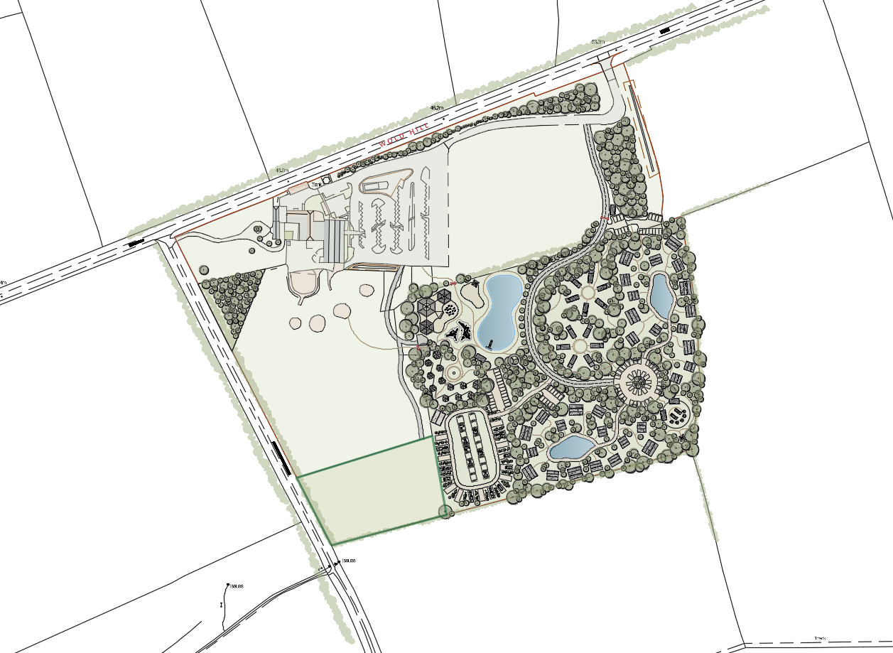 create a detailed landscape rendering of a property map with rolling green fields dense green forests winding pathways and serene reflective blue ponds highlight the borders with a crisp red line for clarity capture the essence of a warm sunny day with soft natural lighting to enhance the vibrant green hues and the gentle blues add subtle textures to the fields and trees for a lush appearance and use a light neutral backdrop to enhance the focus on the property details ensure a sense of peace and tranquility throughout the scene
