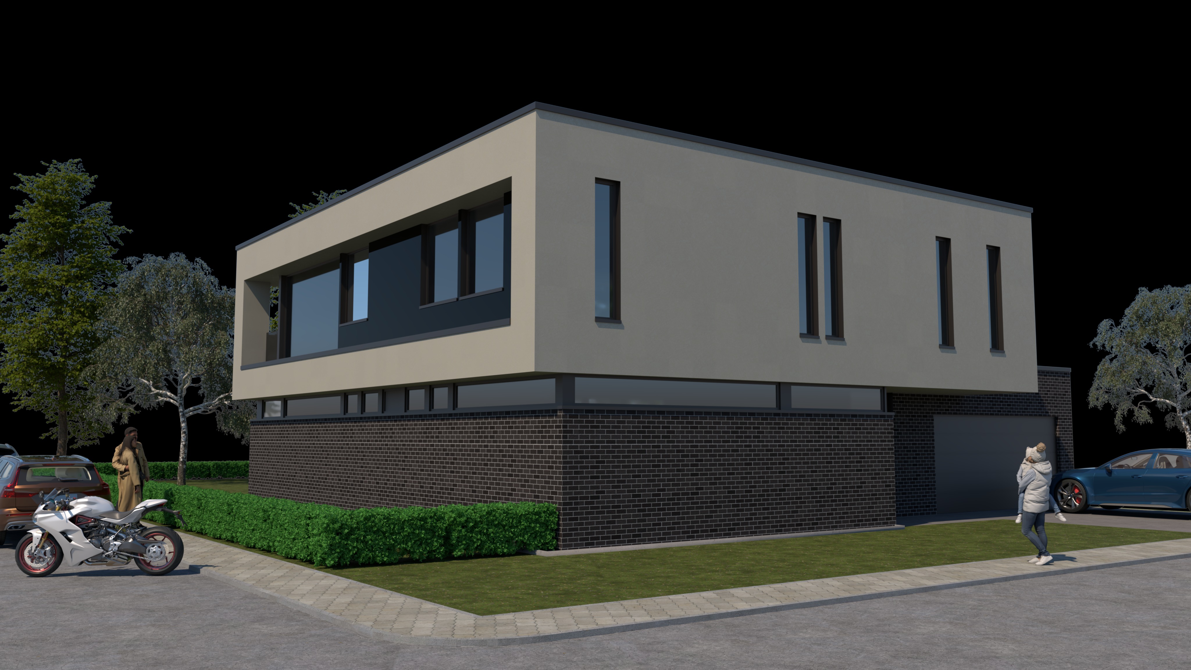 robert a m stern exterior shot use black bricks for the base and a white or beige fassade for the upper part architecture