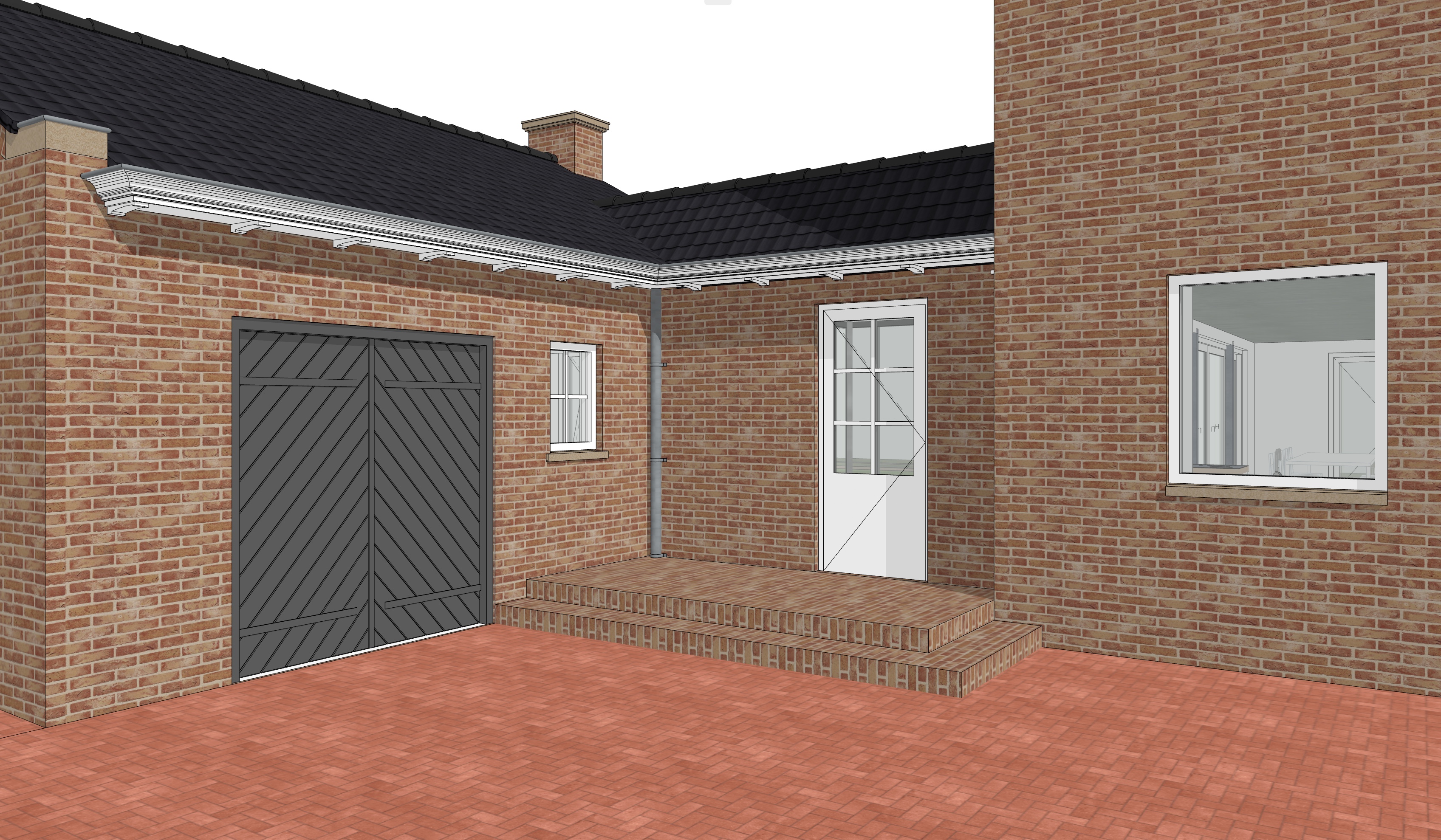 brick house with a modern rustic aesthetic rich red brown bricks for the walls complemented by a slate gray roof the garage doors feature a sophisticated charcoal color with a subtle herringbone pattern white window frames and trim add contrast enhancing the crisp lines the ground is paved with warm terracotta bricks exuding a cozy inviting ambiance the atmosphere is serene and sunlit capturing the essence of a peaceful suburban afternoon
