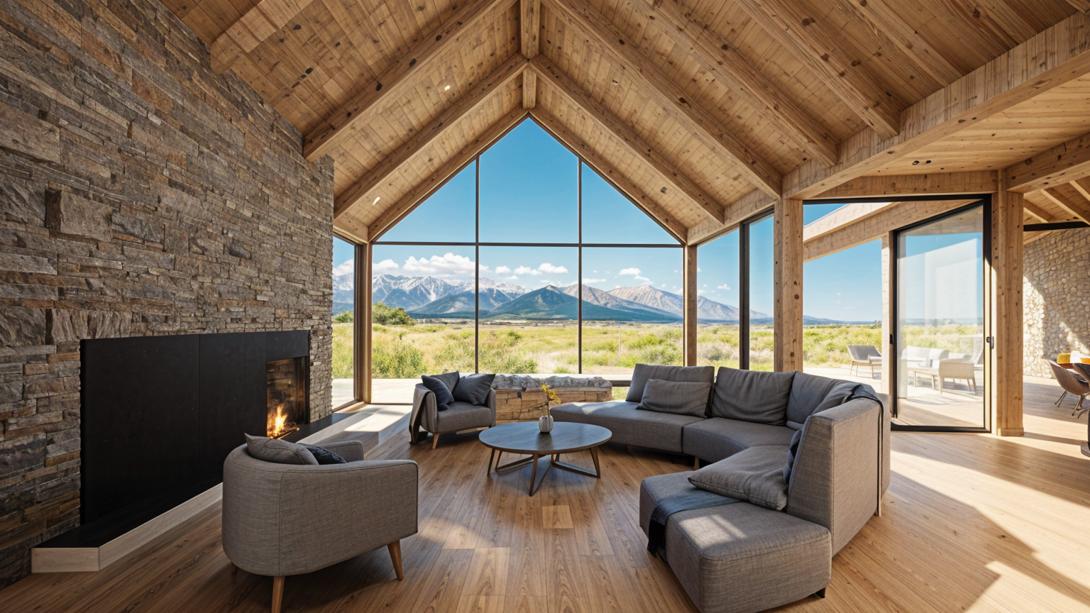 modern architectural house with dark charcoal blue gray roof most walls are a soft beige stucco with a white washed brick accents use a soft walnut wood for accents around windows and pergola the lower half of the house should be a light white washed brick giving a sleek contemporary feel the garage doors are transparent glass surround with lush vibrant green grass for the lawn the atmosphere is bright daylight casting soft shadows with a clear blue sky located in lush seattle the landscape should be full of large cedars hydrangeas roses flowers and boxwoods around the edges of the sidewalks by the house and the front sidewalk