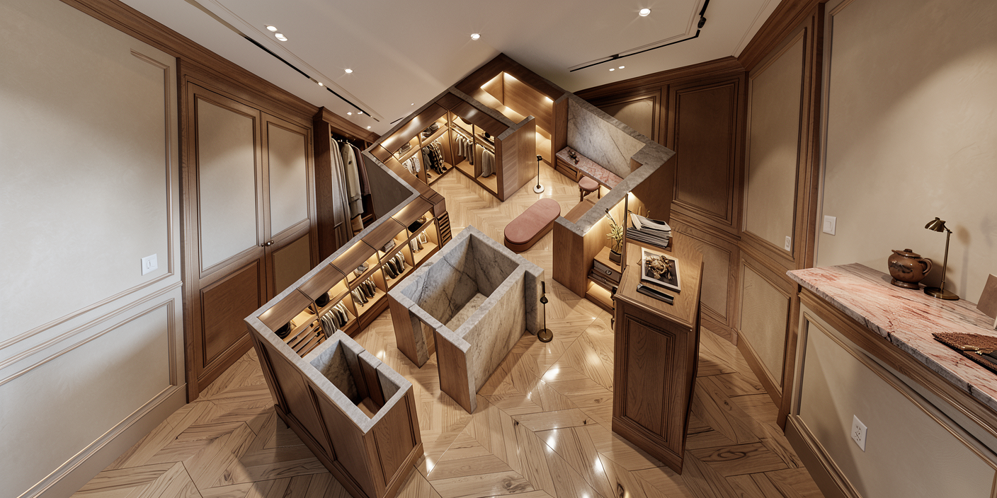 render a luxurious bathroom interior featuring a central walk in bathtub in pristine white with chrome fixtures add a translucent glass shower screen on the left reflecting soft natural light the walls are a soothing light gray complemented by sleek dark tiles on the floor include a minimalist modern toilet on the right bordered by smooth wooden accents the atmosphere is calm and serene enhanced by gentle ambient lighting and a touch of greenery for a fresh natural vibe