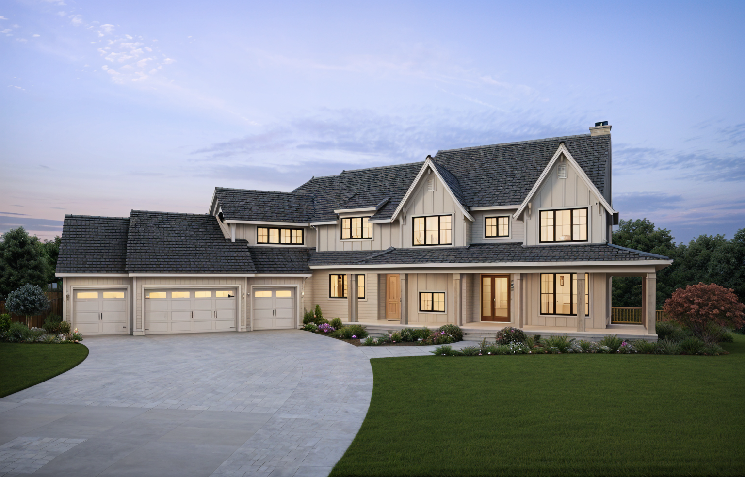 colonial revival exterior shot dark metal siding black trim trim cedar stained door columns brackets and a lighter tan stone architecture