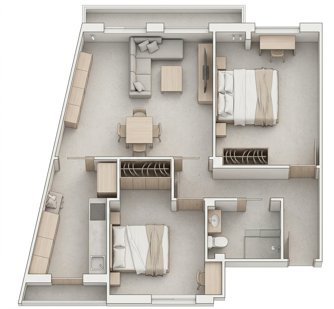 put some stand lamps one in the living room and put some lamps beside the bed also could you put little indoor plants also could you put some rugs to make the render or the place mor ehomey and well designed