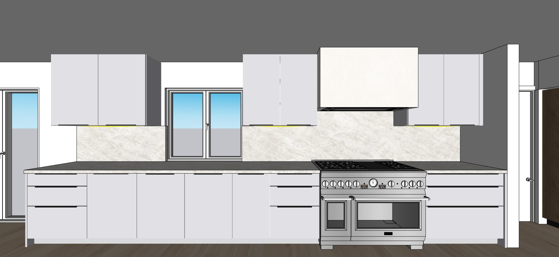 design a sleek modern kitchen interior featuring white cabinets with soft matte texture and subtle black handles the countertop and backsplash should have a polished taj mahal quartzite the atmosphere is bright and airy with sunlight streaming through the windows casting gentle shadows on the floor include a high end stainless steel oven the hood surround is a warm venetian plaster that complements the taj mahal quartzite use warm wooden flooring to bring a cozy feel the walls are painted in light beige creating a calm and sophisticated ambiance the ceiling should be a soft white to enhance the spacious feel