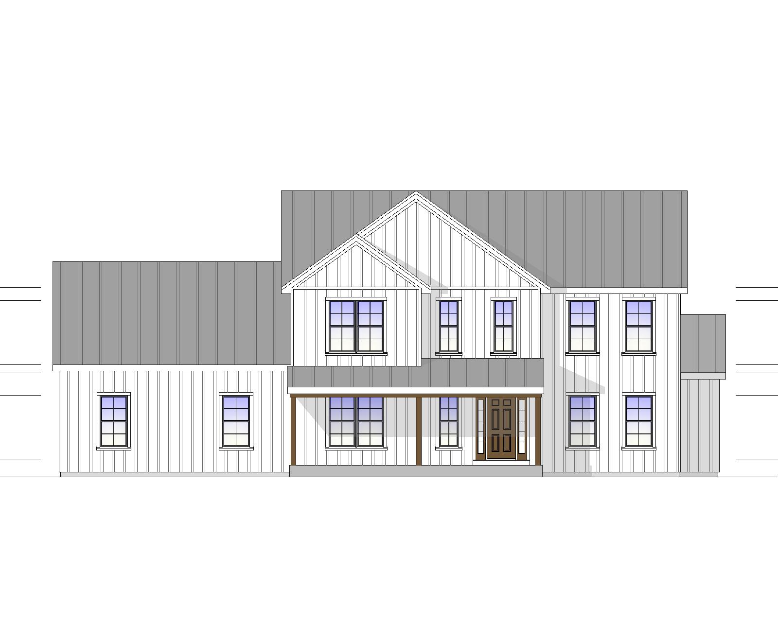 colonial revival exterior shot a two story modern farmhouse with a charming exterior the main structure is painted in a bright white with dark grey metal roofing window frames in crisp black add a touch of contrast a welcoming front door in a deep wood finish enhances the entryway the house is surrounded by lush greenery featuring vibrant green shrubs and a few colorful flower beds the atmosphere is serene illuminated by a warm golden sunset sky casting long shadows and a soft glow over the house architecture