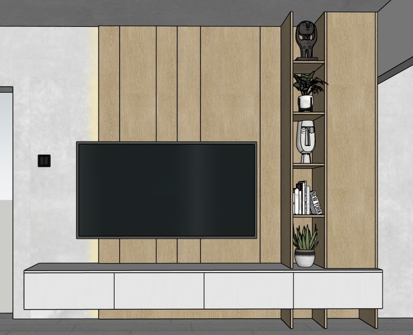 ultra high end tv wall architectural visualization rendered directly from an existing sketchup model strictly preserving 100 of the original design geometry proportions materials cabinetry layout appliances accessories and original camera view exactly as provided no design changes no object replacement no camera movement no crop no lens change render only photorealistic corona renderer output 4k 8k resolution ultra sharp details clean edges realistic textures professional archviz quality like a full frame dslr photograph studio grade 4pixos quality sophisticated lighting setup elegant luxurious soft and refined lighting balanced exposure subtle global illumination realistic soft shadows gentle highlights on wood cabinets and stone countertop warm neutral tone cozy yet premium atmosphere modern minimalist kitchen interior with light wood cabinetry neutral color palette matte finishes clean lines realistic reflections high material fidelity cinematic composition realistic depth natural perspective high dynamic range premium interior lifestyle photography look
