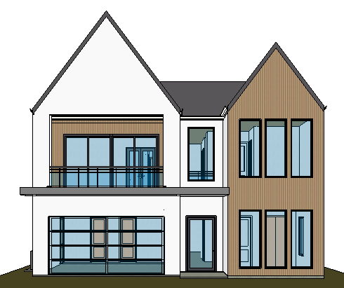 render a photorealistic 3d perspective of this house in a houston neighborhood reference the current material style just enhance them dark grey shingle roof vertical wood siding stucco walls keep model geometry the same windows doors roof walls garage door pavement driveway make a lush vegetation that looks native to truckee ca do not change the view only enhance the current materials and make the landscape nicer vegetation detailed textures in the wood siding and glass reflections and a vibrant clear sky with light atmospheric depth render in hyper realistic architectural visualization quality 8k resolution