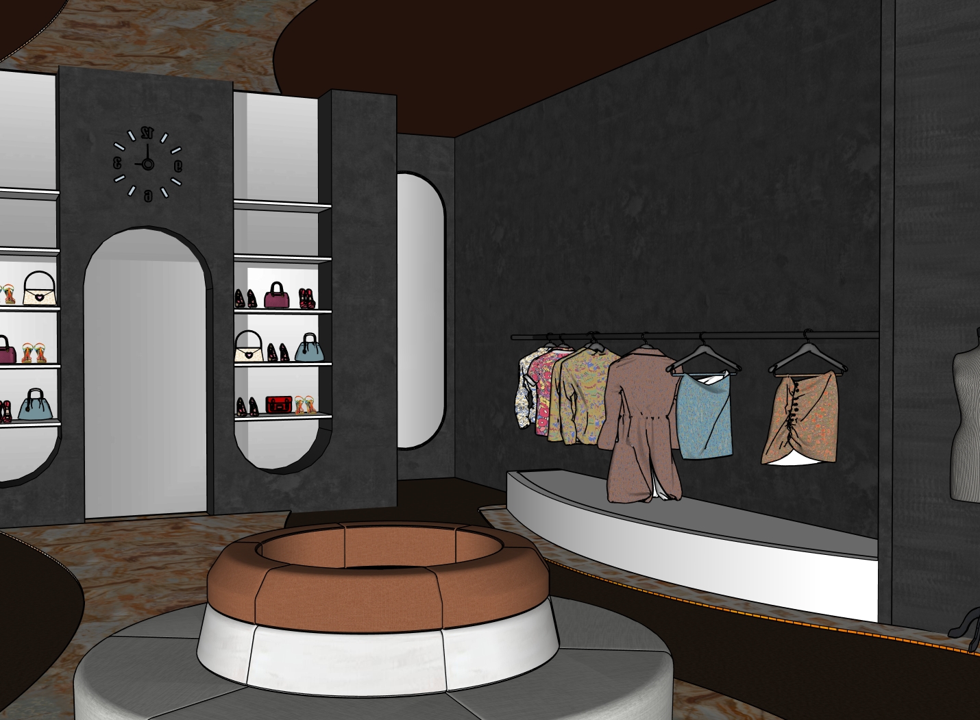 photorealistic luxury boutique render using the reference image exactly keep all materials layout and finishes unchanged the back wall is solid all arches and mirrors are symmetrical and the ceiling is mirrored use warm orange ambient lighting that follows all curves add 2 4 well dressed shoppers naturally interacting in the space subtle and not blocking the architecture maintain a moody high end retail atmosphere